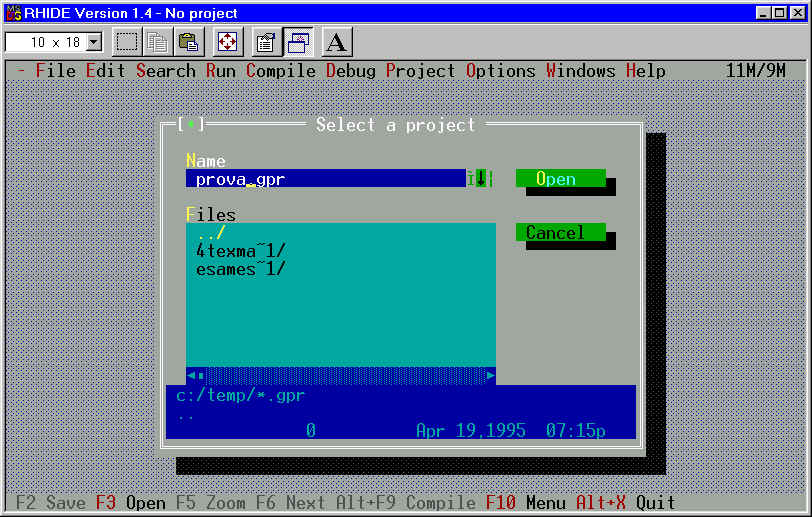 Appena avviato, RHIDE mostra una finestra vuota. Per iniziare a lavorare, la cosa migliore e' aprire un nuovo progetto. Per fare questo, basta scegliere la voce Apri dal menu' Progetto, e immettere un nome di progetto nuovo (cioe' non gia' utilizzato). Il nome deve avere l'estensione .gpr, ad esempio prova.gpr: