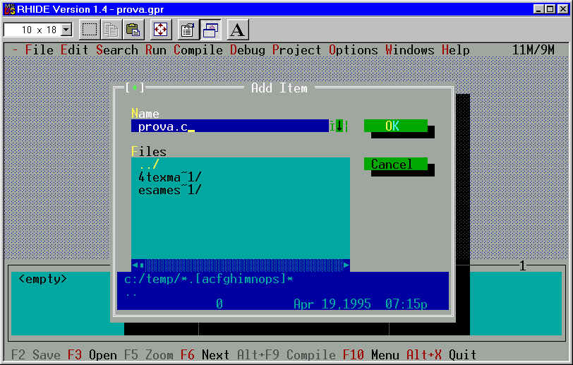 Ora occorre inserire nel progetto il file (o i file) che ne devono fare parte (non e' necessario che esistano gia'). Per aggiungere file al progetto, basta premere il tasto INS sulla tastiera, e selezionare (o digitare i nomi, per i file nuovi) i file da aggiungere, premendo OK volta per volta. A immissione terminata, premere cancel (annulla). Ad esempio, per aggiungere al progetto il file prova.c:
