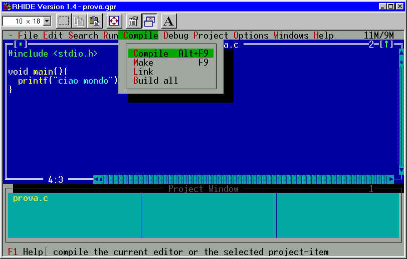 IN ALTERNATIVA, le due fasi compilazione + collegamento possono essere svolte automaticamente da RHIDE, in sequenza, scegliendo la voce Make (costruisci) dal menu' Compile.
