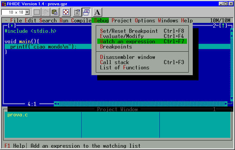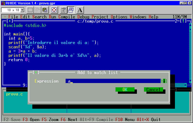 Scegliendo questa opzione (o premendo l'equivalente combinazione CTRL+F7), apparira' una finestrina che chiedera' di introdurre l'espressione da "tenere d'occhio". Solitamente, tale espressione sara' semplicemente il nome di una variabile. Nel nostro esempio, non essendoci variabili, cio' e' inutile: ma in altri casi e' di estrema utilita'. Si veda ad esempio il seguente programma modificato: