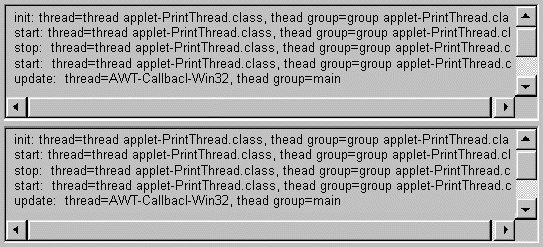 PrintThreadapplets.PrintThreadis a modified version of SimpleApplet that prints the thread and thread group that itsinit,start,stop,destroy, andupdatemethods are called from. (Actually, due to a Netscape Navigator 2.0 for Windows 95/NT bug, the following applets don't implementupdate. If you aren't using a PC that's running Netscape Navigator 2.0, you should be able to run the real example.) Here's the code for thehobbled example, and for the