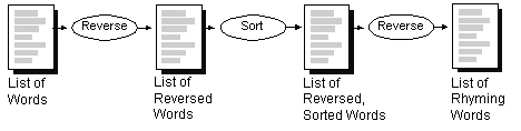 Next, we investigate a program that implements what's represented by the diagram in the previous figure. This program uses PipedReader and PipedWriter to connect the input and output of its reverse and sort methods in order to create a list of rhyming words. Several classes make up this program. This section shows and discusses only the elements of the program that read from and write to the pipes. Follow the code links presented here to see the whole program.