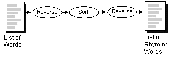 The innermost call to reverse takes a FileReader opened on the file words.txt that contains a list of words. The return value of reverse is passed to sort, whose return value is then passed to another call to reverse.