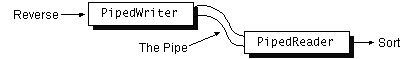 reverse starts a ReverseThread(in a .java source file) that writes its output to the PipedWriter and then returns the PipedReader to the caller. The caller then arranges for a sorting thread to read from it. The sort method is exactly the same, except that it creates and starts a SortThread(in a .java source file).