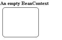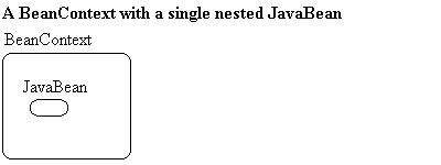 Output:import java.beans.beancontext.*; /** * A test program that adds a bean to a beancontext, and * reports on various aspects of the context's membership state. * This program also shows that a bean's getBeanContext() method * can be called to get a reference to its enclosing context. */ public class Example1 { private static BeanContextSupport context = new BeanContextSupport(); // The BeanContext private static BeanContextChildSupport bean = new BeanContextChildSupport(); // The JavaBean public static void main(String[] args) { report(); // Add the bean to the context System.out.println("Adding bean to context..."); context.add(bean); report(); } private static void report() { // Print out a report of the context's membership state. System.out.println("============================================="); // Is the context empty? System.out.println("Is the context empty? " + context.isEmpty()); // Has the context been set for the child bean? boolean result = (bean.getBeanContext()!=null); System.out.println("Does the bean have a context yet? " + result); // Number of children in the context System.out.println("Number of children in the context: " + context.size()); // Is the specific bean a member of the context? System.out.println("Is the bean a member of the context? " + context.contains(bean)); // Equality test if (bean.getBeanContext() != null) { boolean isEqual = (bean.getBeanContext()==context); // true means both references point to the same object System.out.println("Contexts are the same? " + isEqual); } System.out.println("============================================="); } }File:============================================= Is the context empty? true Does the bean have a context yet? false Number of children in the context: 0 Is the bean a member of the context? false ============================================= Adding bean to context... ============================================= Is the context empty? false Does the bean have a context yet? true Number of children in the context: 1 Is the bean a member of the context? true Contexts are the same? true =============================================Example2.java
