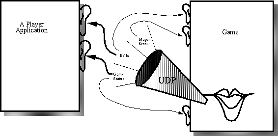 The Game sends three kinds of information to the Players:The Game needs to send this information to all of the Players simultaneously. Most notably, the balls must be sent to all Players at the same time so that the Game does not favor one Player over the others--timing can make a critical difference in the game. Sending information to many recipients at the same time can be accomplished using UDP and is known as broadcasting. If you don't know about UDP and how it works, refer to Overview of Networking